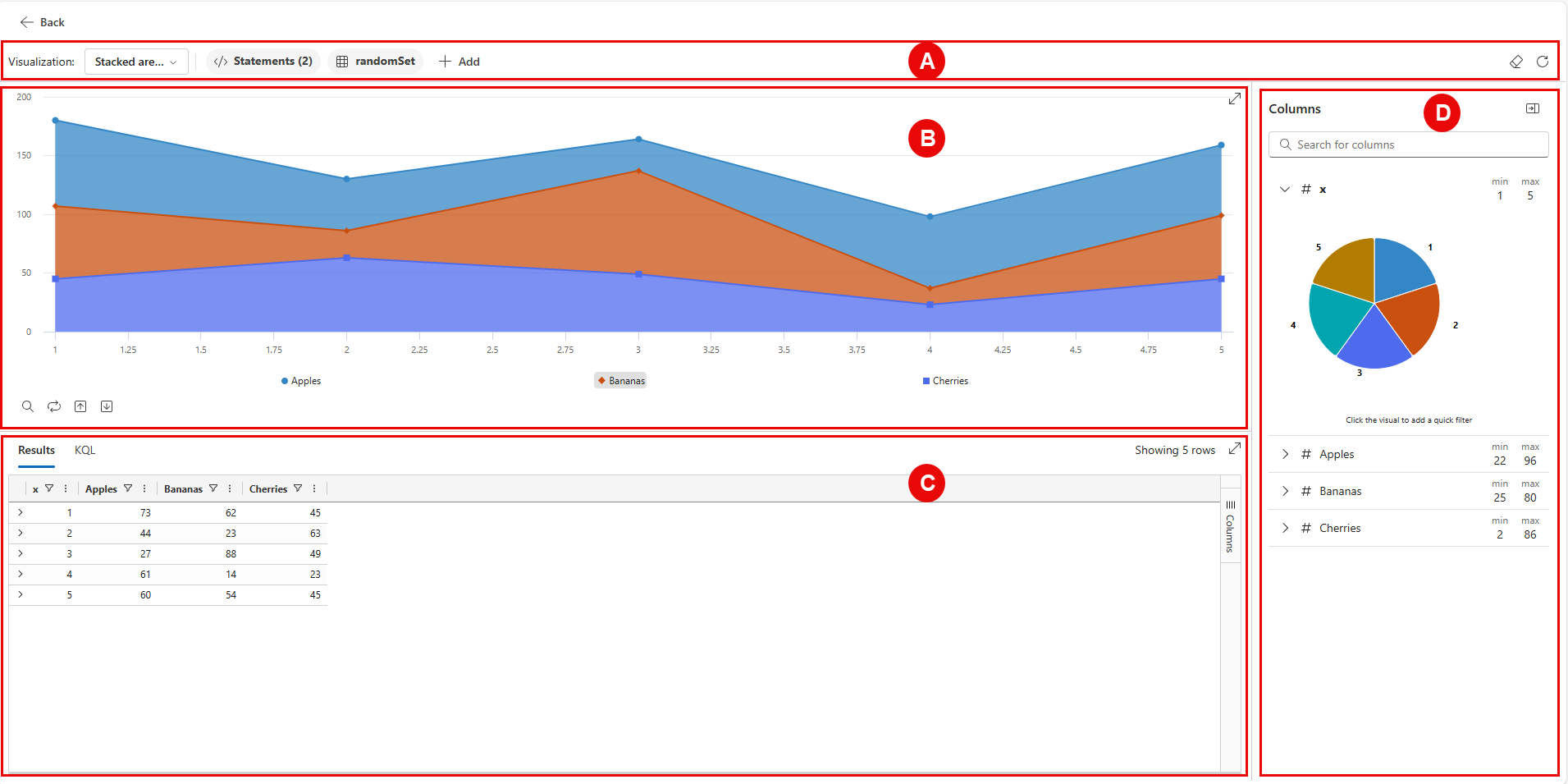 A. Filter and aggregations bar: Shows filters and aggregations from the original query, added filters and aggregations, and the refresh data button.