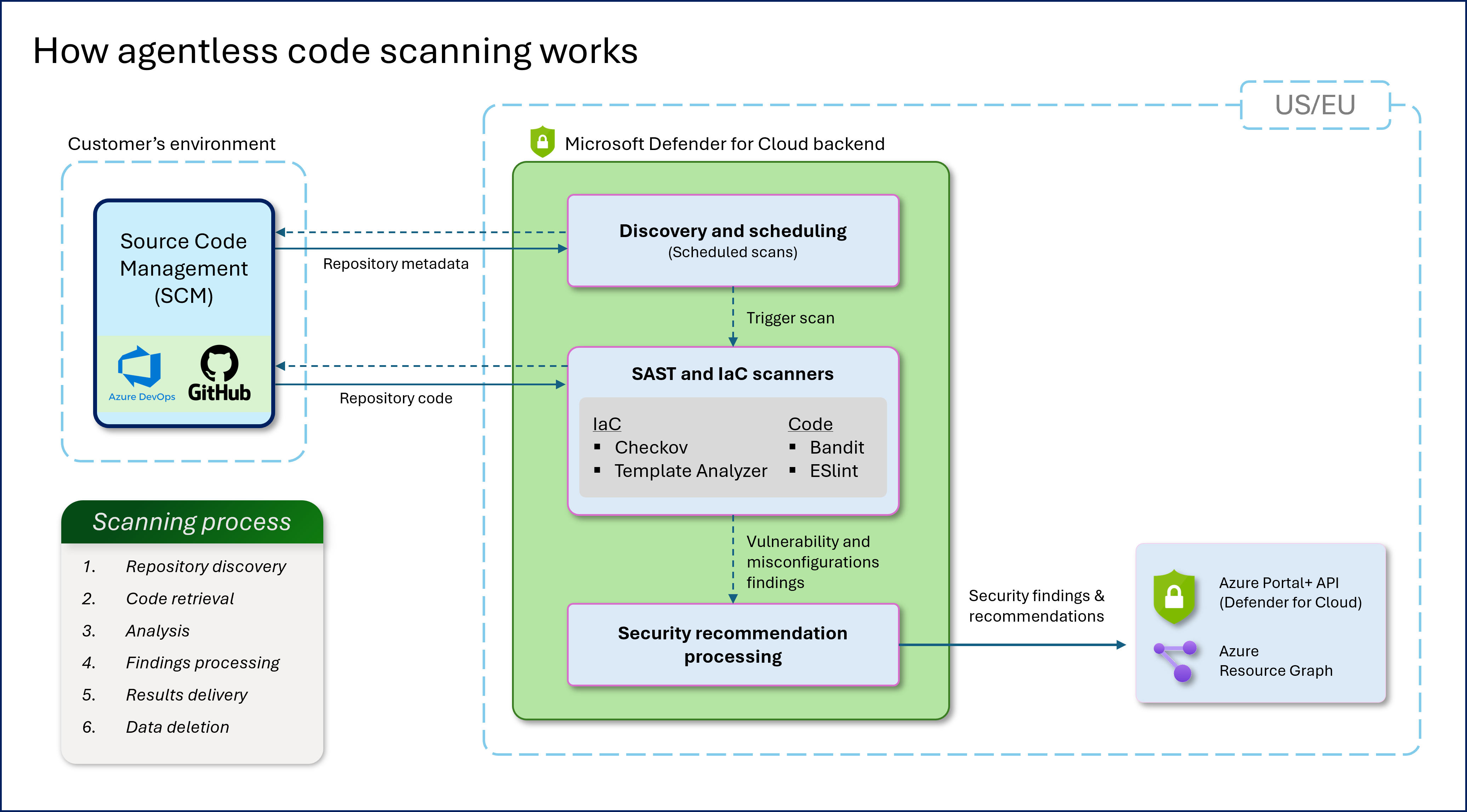 Agentless code scanning in Microsoft Defender for Cloud offers fast and scalable security coverage for all repositories in Azure DevOps and GitHub. Agentless code scanning automatically scans code, open-source dependencies, and infrastructure-as-code (IaC) to identify vulnerabilities and misconfigurations without requiring any changes to your build or deployment pipelines. This approach simplifies setup and maintenance with a single Azure DevOps or GitHub connector, and provides broad coverage, continuous insights, and actionable security findings. It lets security and development teams focus on fixing risks smoothly without interrupting development workflows.