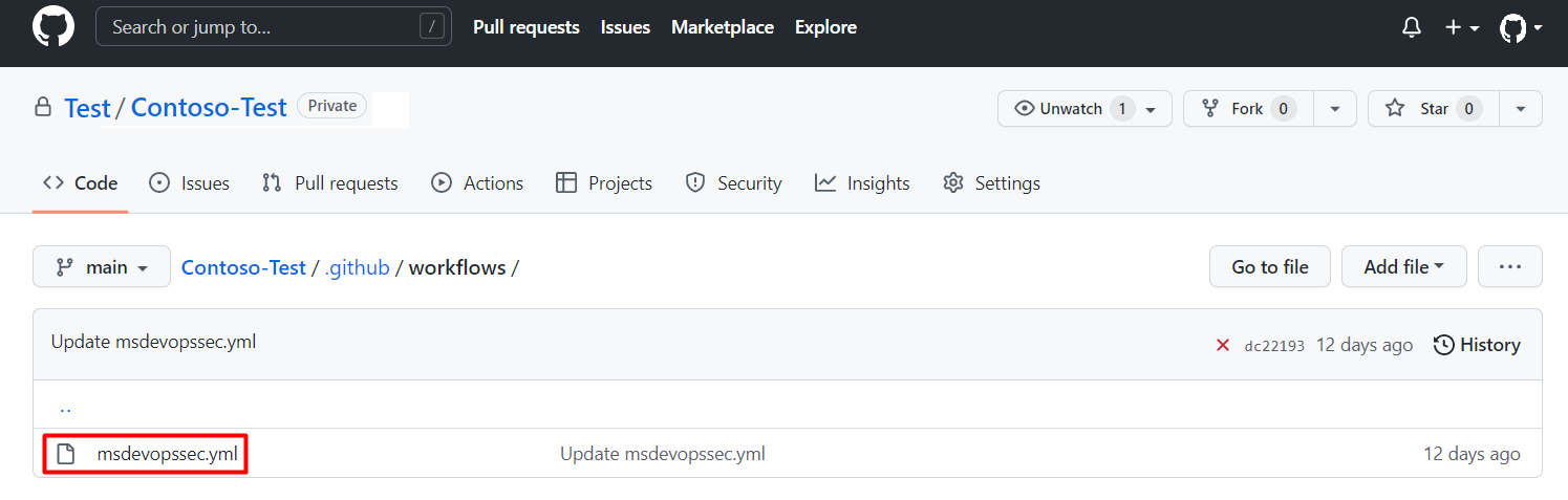 Your repository's home page> .github/workflows.Select msdevopssec.yml, which was created in the prerequisites.