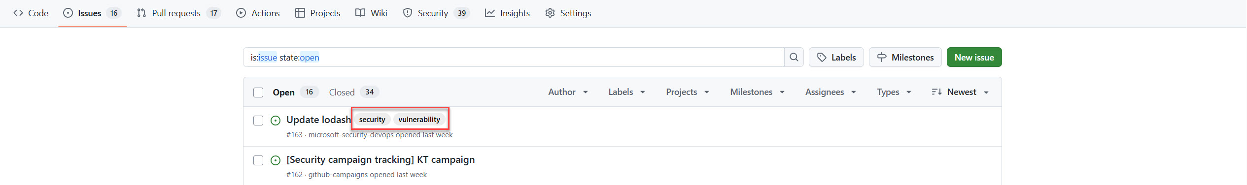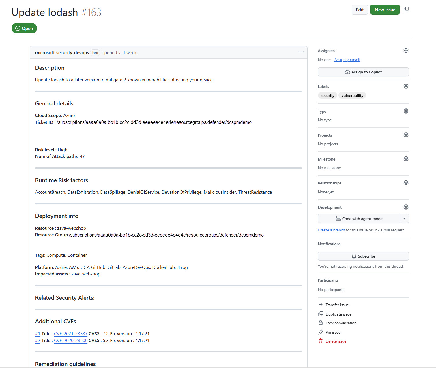 Security managers can assign security recommendations for resolution to the relevant engineering teams by generating a GitHub issue assignment.