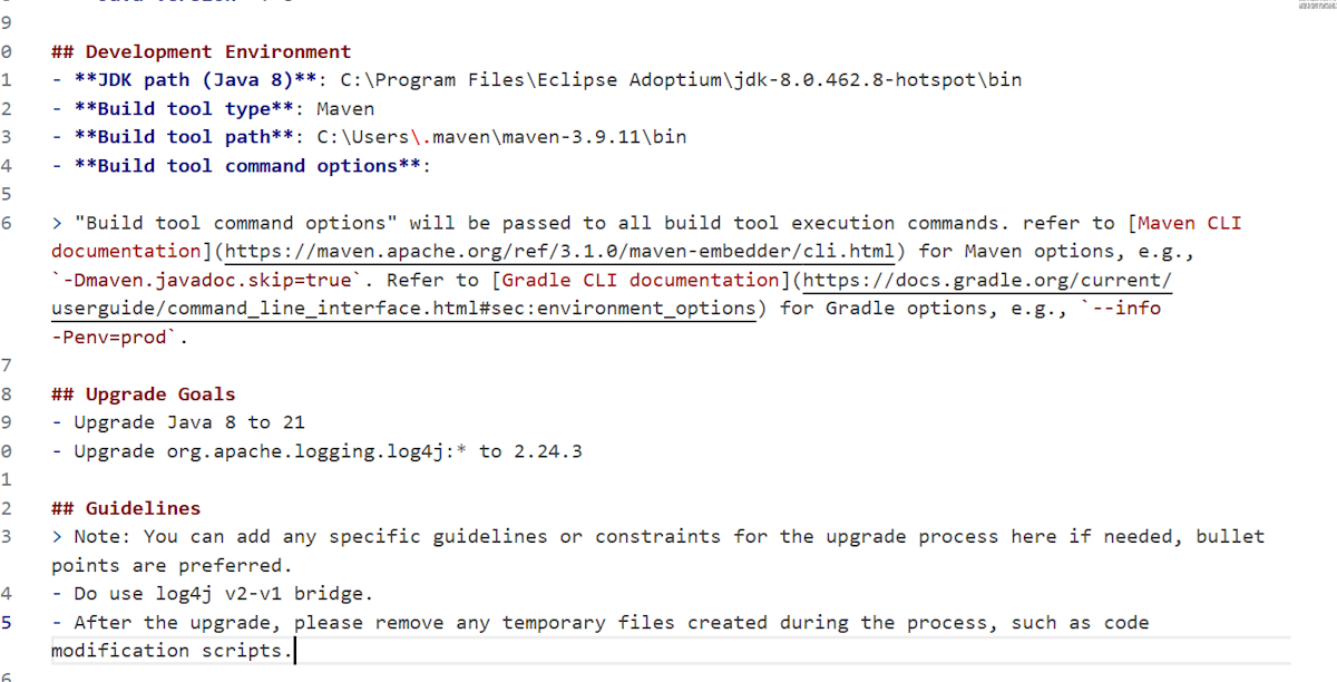 In the Upgrade Goals section, you can now specify more upgrade targets along with the objectives in your initial prompt. For example, if the primary task is to upgrade the project from Java 17 to Java 21, but the project also requires upgrading Log4j from 1.x to 2.x, you can list that as an additional goal, as shown in the following example prompt: