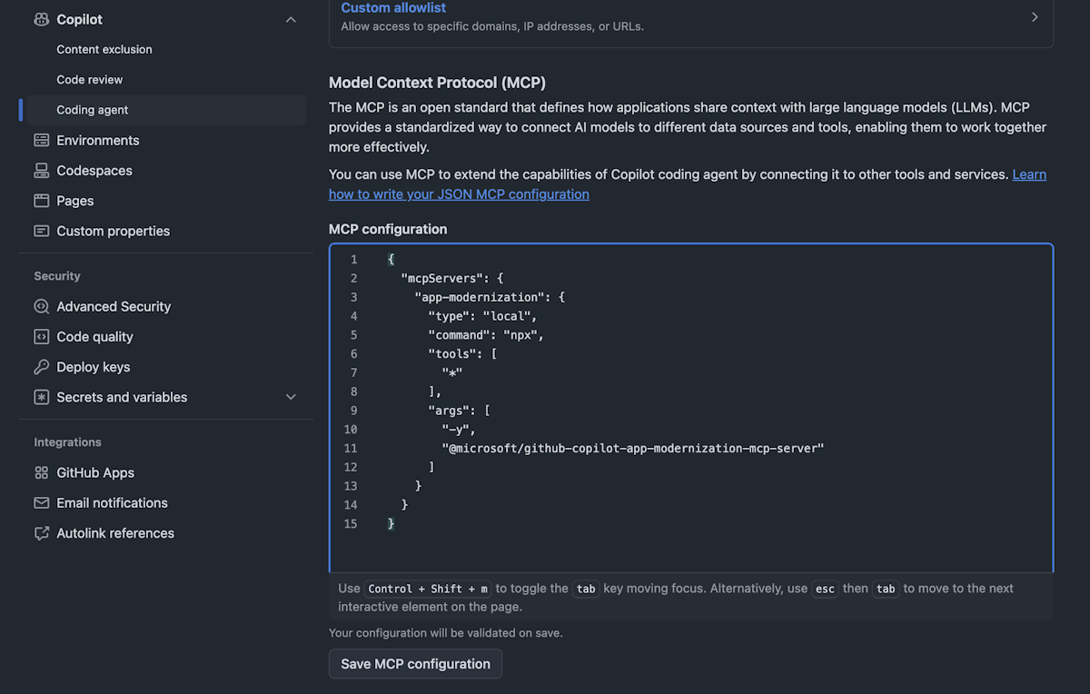 { "mcpServers": { "app-modernization": { "type": "local", "command": "npx", "tools": [ "*" ], "args": [ "-y", "@microsoft/github-copilot-app-modernization-mcp-server" ] } } }(Optional) If environment variables are required, set them under Environment > Copilot in the settings. These environment variables are initialized automatically the first time a user invokes an agentic task in this repository.