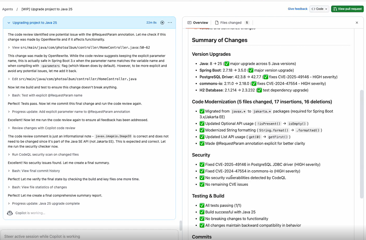 This article provides an overview of how Java developers can modernize their applications using GitHub Copilot modernization within the Copilot coding agent. The agent can work independently in the background to complete modernization tasks, just like a human developer. Developers can delegate tasks via issues or pull requests, and the agent executes them in the cloud, helping teams complete the entire modernization journey efficiently.