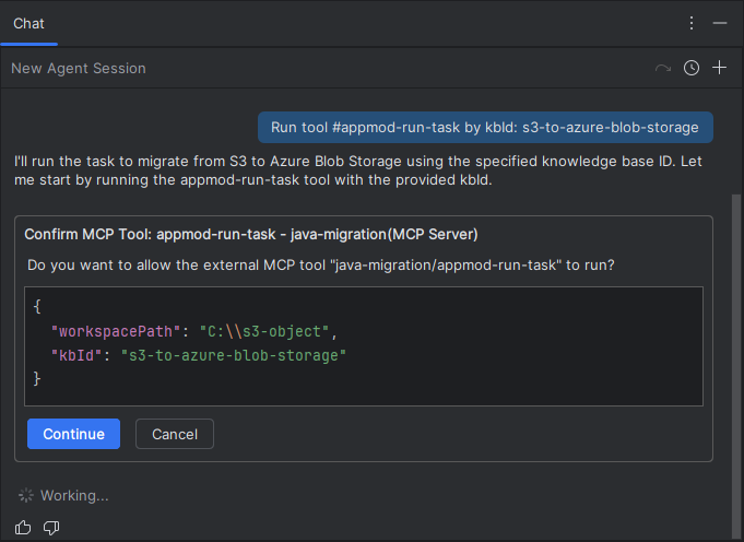Sometimes, GitHub Copilot modernization requires explicit confirmation before proceeding. You can type yes or continue in the chat to enable the agent to move forward with the code modifications.