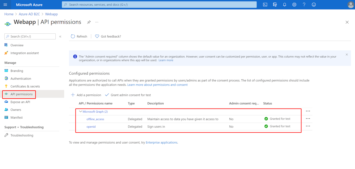 Referring to the previous steps, we create a WebApiB application and expose an application permission WebApiB.SampleScope.