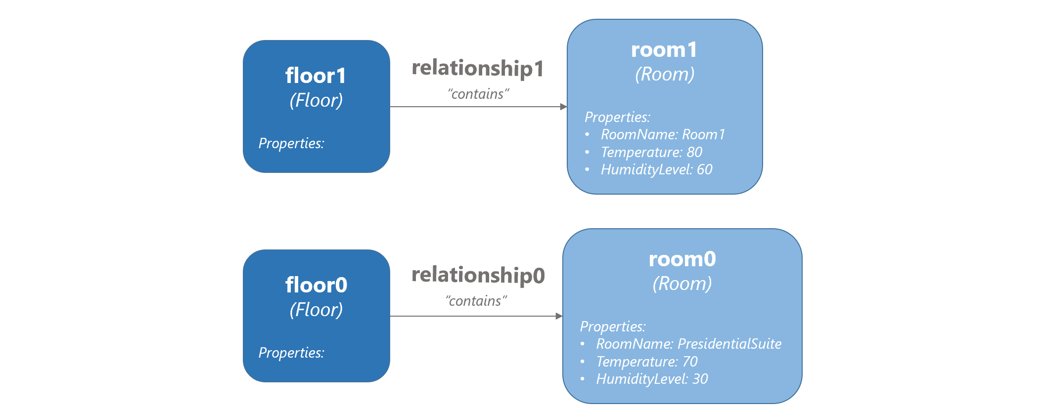 The types of relationships that you can create from one twin to another are defined within the models that you uploaded earlier. The model definition for Floor specifies that floors can have a type of relationship called contains. Since the model definition specifies this relationship, it's possible to create a contains-type relationship from each Floor twin to the corresponding room that it contains.