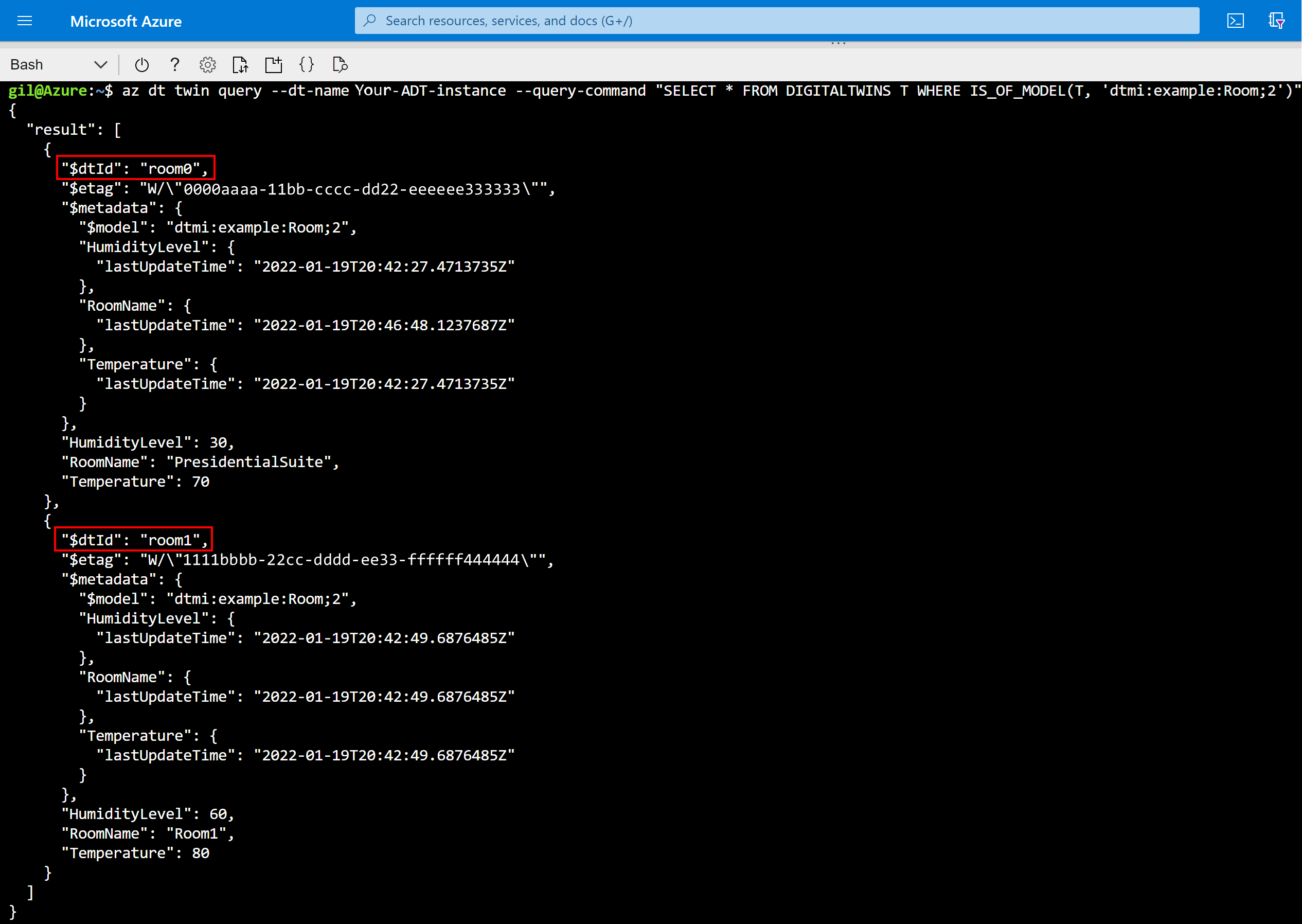 az dt twin query --dt-name <Azure-Digital-Twins-instance-hostname-or-name> --query-command "SELECT * FROM DIGITALTWINS T WHERE IS_OF_MODEL(T, 'dtmi:example:Room;2')"You can restrict your query to twins of a certain type, to get more specific information about what's represented. The result of this shows room0 and room1, but doesn't show floor0 or floor1 (since they're floors, not rooms).