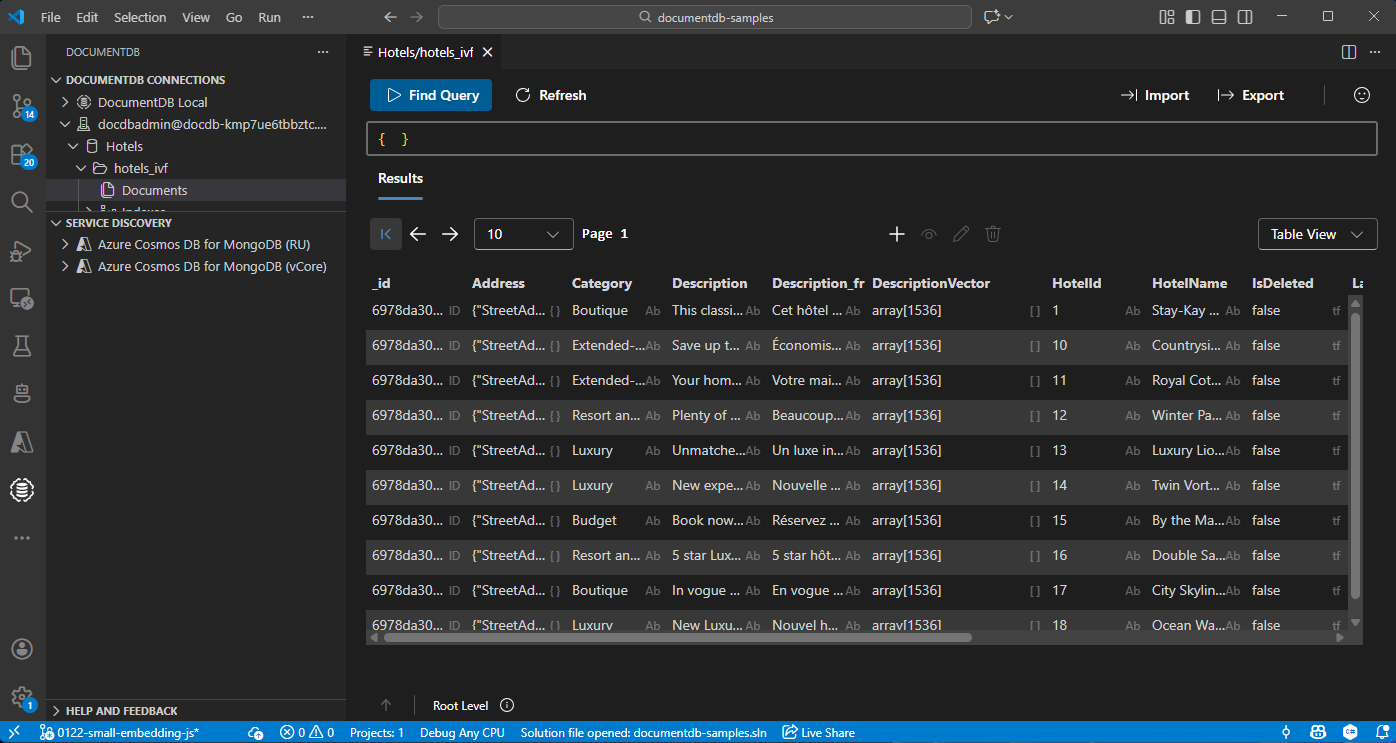 JsonData: Interface for the data structurescoreProperty: Location of the score in query results based on vector search methodgetClients: Creates and returns clients for Azure OpenAI and Azure DocumentDBgetClientsPasswordless: Creates and returns clients for Azure OpenAI and Azure DocumentDB using passwordless authentication. Enable RBAC on both resources and sign in to Azure CLIreadFileReturnJson: Reads a JSON file and returns its contents as an array ofJsonDataobjectswriteFileJson: Writes an array ofJsonDataobjects to a JSON fileinsertData: Inserts data in batches into a MongoDB collection and creates standard indexes on specified fieldsprintSearchResults: Prints the results of a vector search, including the score and hotel name