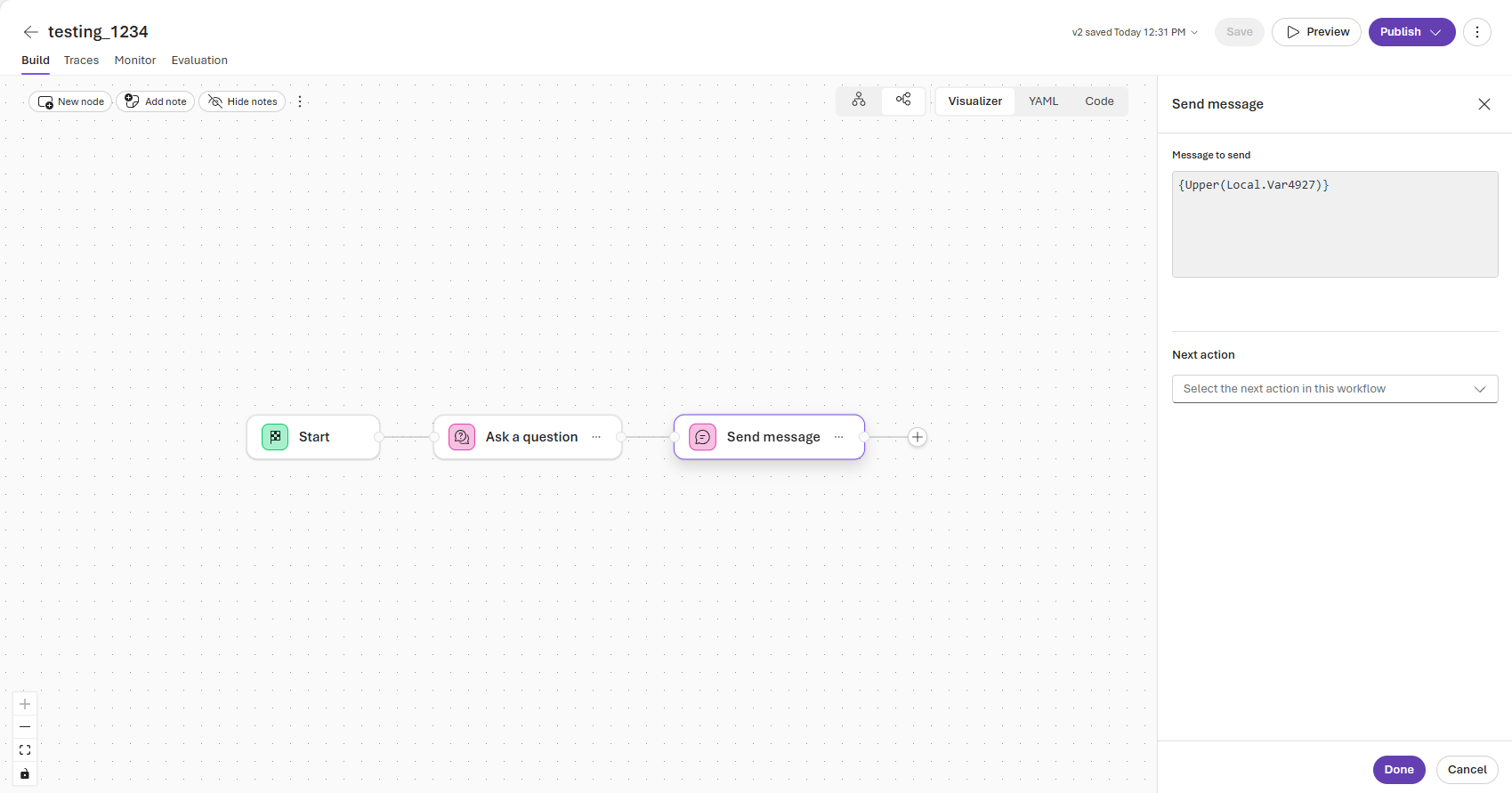 Var01. Then select Done.Add a Send message action. On the pane that appears, in the Message to send area, enter