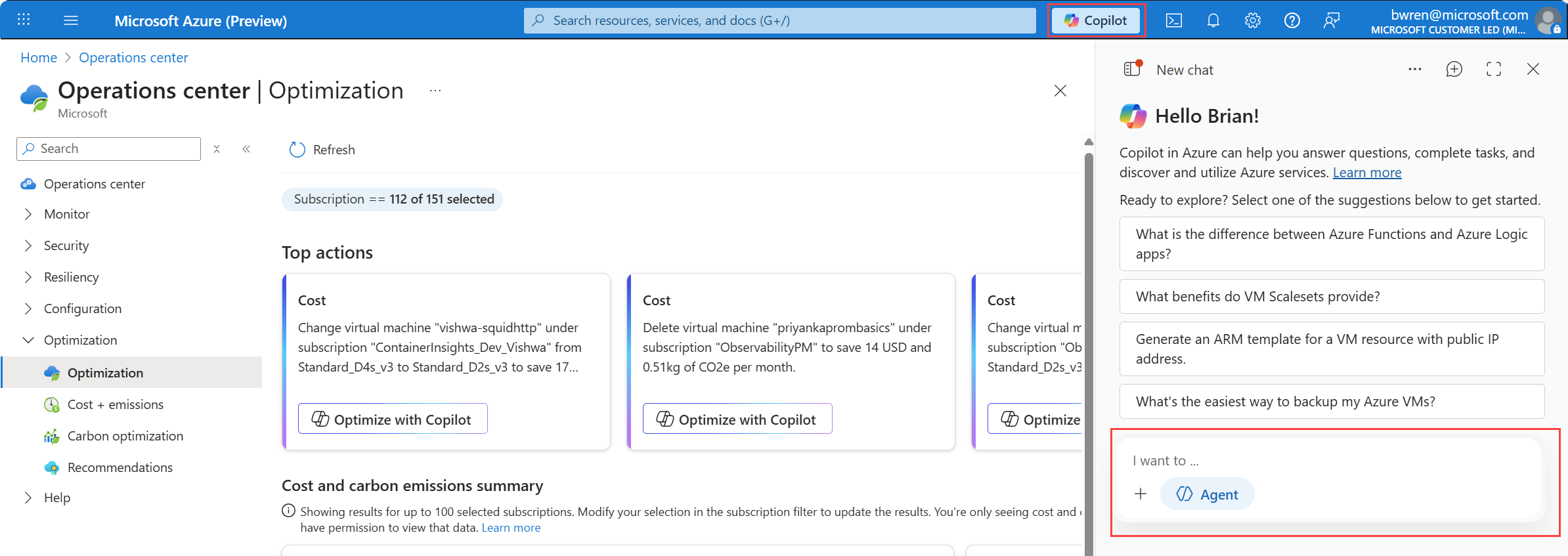The Optimization agent in operations center provides an agentic experience to help you identify and implement cost-saving and carbon-reduction measures. The agent uses Azure Copilot to analyze your resource usage patterns and recommend actions to optimize your Azure environment. You can either initiate a conversation with the agent using prompts or select specific recommendations to get guided assistance.