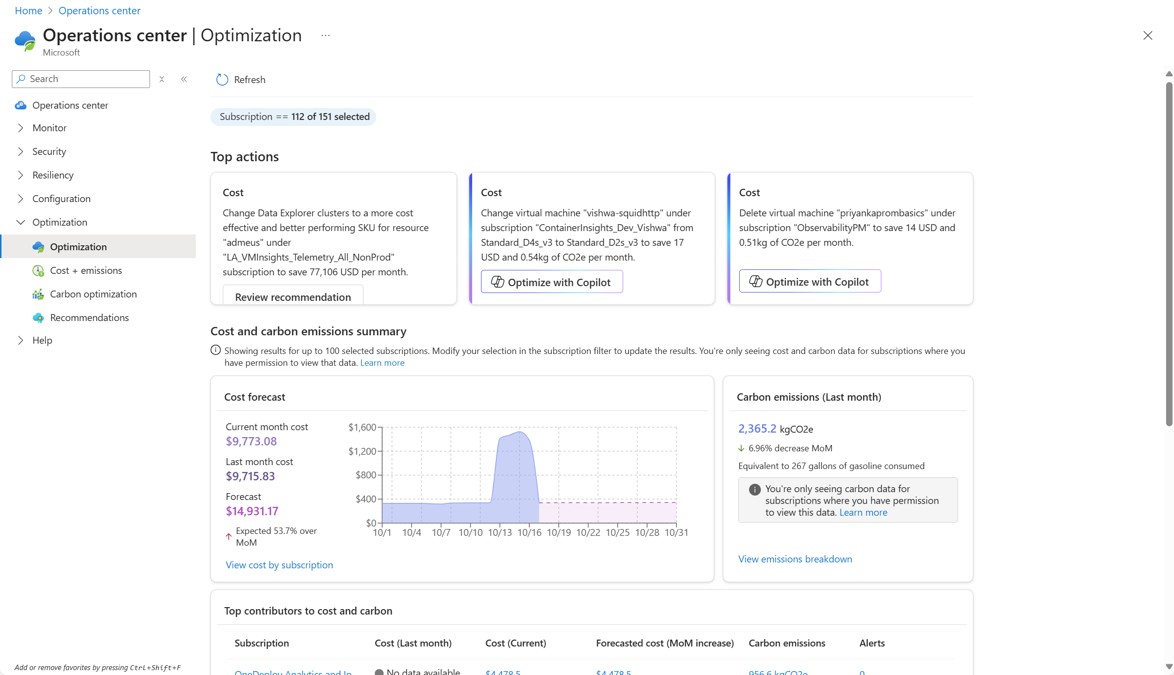 | Cost and carbon emissions summary | Summarizes the data from the previous month and forecasts the next month for all selected subscriptions and the top contributing subscriptions. Drill into any of these views to open other pages in the Optimization menu for additional details. |