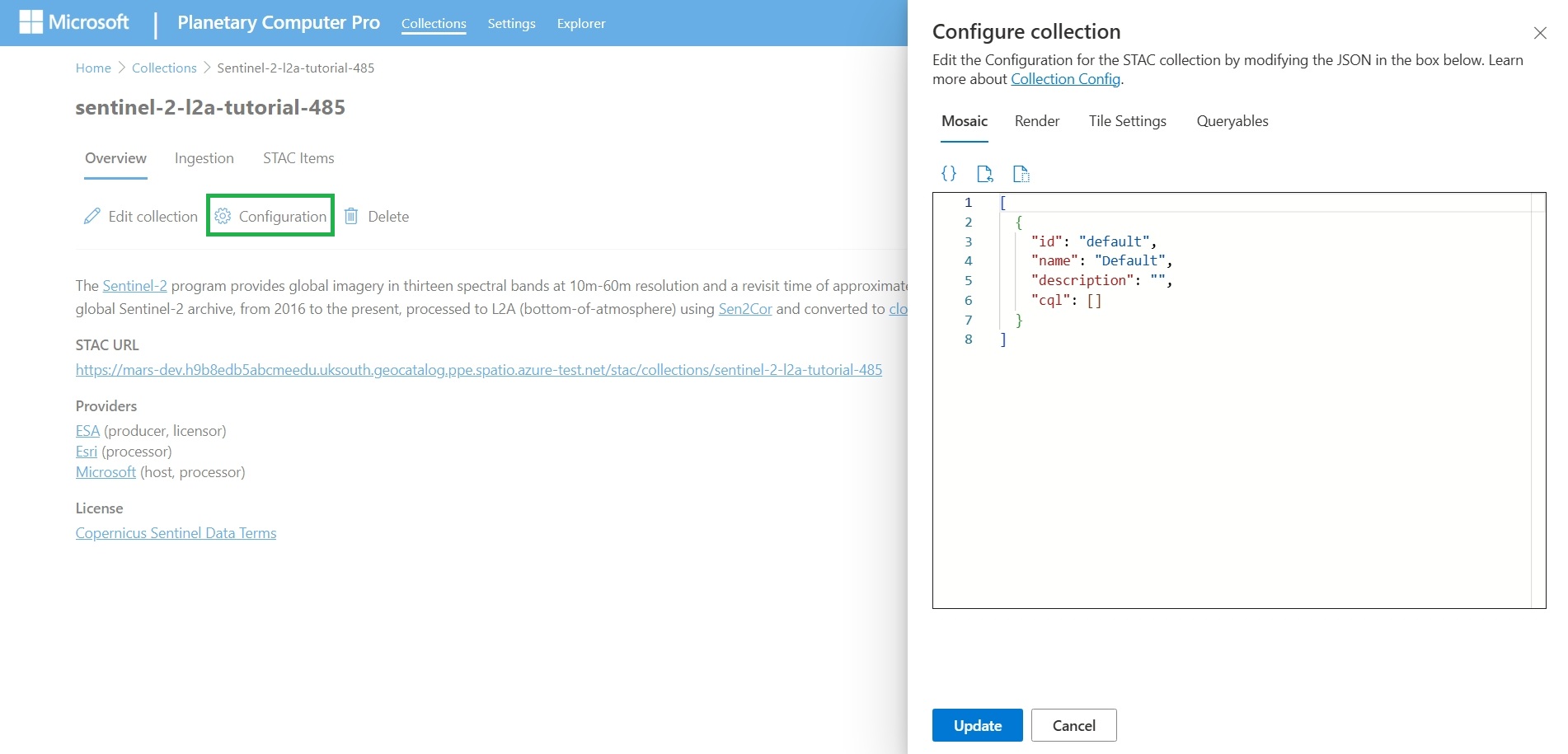 The Configure collection panel opens and there are tabs for Mosaic, Render, Tile Settings, and Queryables, each of which you can define in JSON format. You can either write your own JSON or load and modify a template.