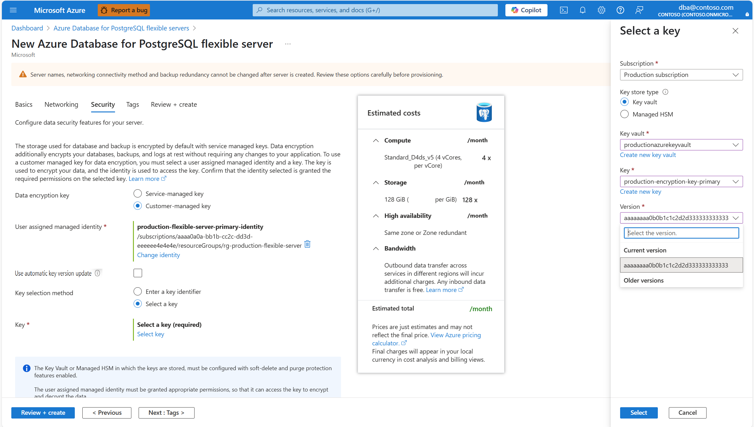 Identities shown in the combo-box are only the ones that your Azure Database for PostgreSQL flexible server instance was assigned. Although it isn't required, to maintain regional resiliency, we recommend that you select user managed identities in the same region as your server. And if your server has geo-backup redundancy enabled, we recommend that the second user managed identity, used to access the data encryption key for geo-redundant backups, exists in the paired region of the server.
