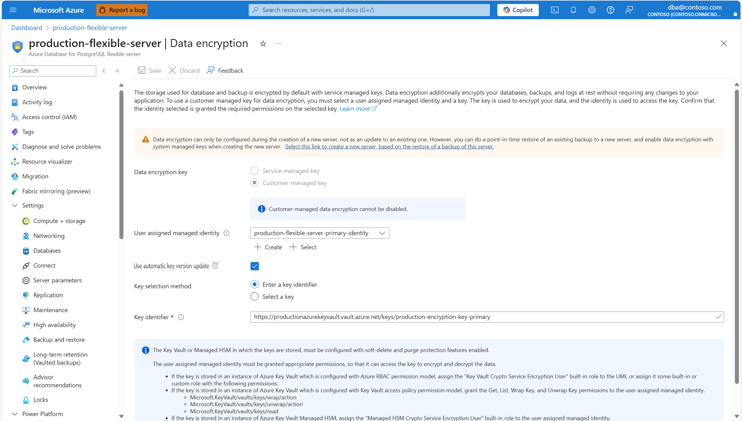 If you rotate the key and don't have Use automatic key version update enabled. Or if you want to use a different key, you must update your Azure Database for PostgreSQL flexible server instance, so that it points to the new key version or new key. To do that, you can copy the resource identifier of the key, and paste it in the Key identifier box.