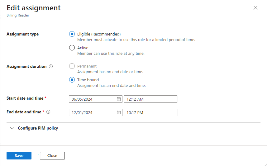 | time-bound eligible | Duration | A role assignment where a user is eligible to activate the role only within start and end dates. |