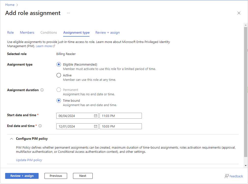 If you have a Microsoft Entra ID P2 or Microsoft Entra ID Governance license, Microsoft Entra Privileged Identity Management (PIM) is integrated into role assignment steps. For example, you can assign roles to users for a limited period of time. You can also make users eligible for role assignments so that they must activate to use the role, such as request approval. Eligible role assignments provide just-in-time access to a role for a limited period of time.
