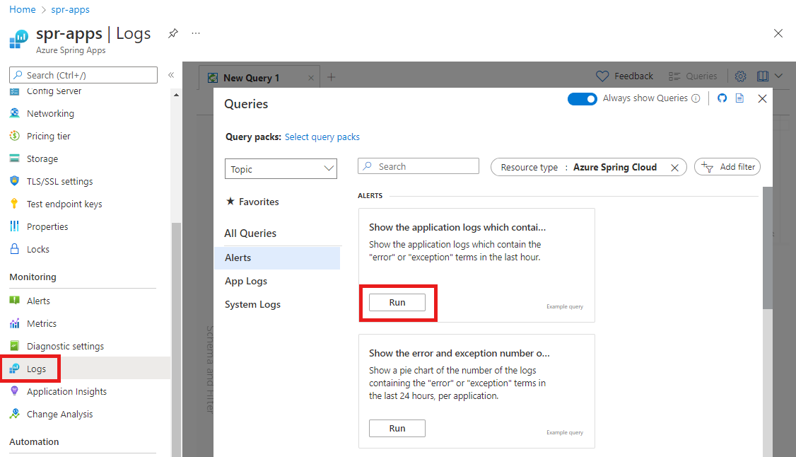 In the Queries pane under Show the application logs that contain the "error" or "exception" terms, select Run.