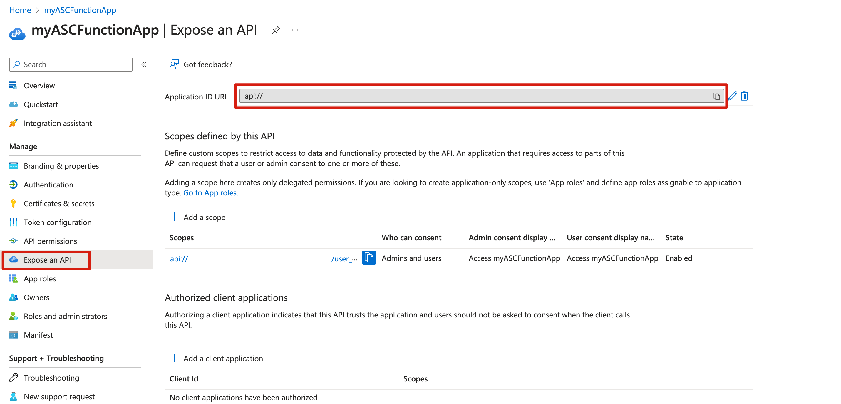 To get the Application ID URI, select Expose an API in the navigation pane, and then copy the Application ID URI value.