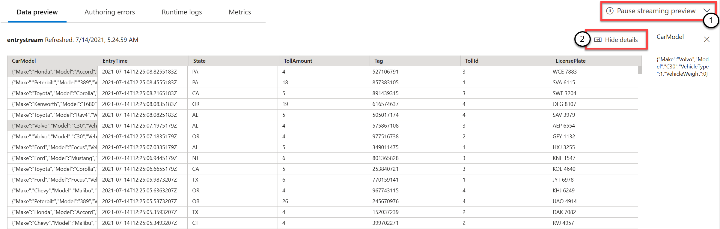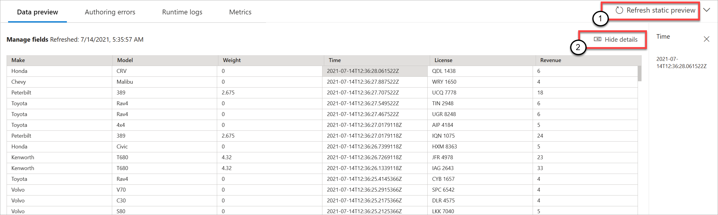 You can refresh the preview by selecting Refresh static preview (1). When you refresh the preview, the Stream Analytics job takes new data from the input and evaluates all transformations. Then it sends output again with any updates that you might have performed. The Show/Hide details option is also available (2).