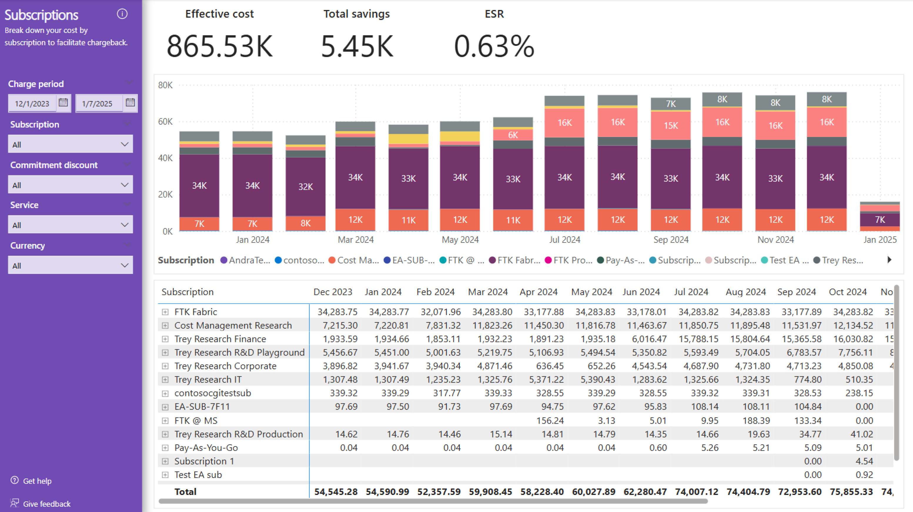 The Subscriptions page includes a breakdown of cost by subscription. This page is useful for building a chargeback report and determining which departments/teams/environments, depending on how you use subscriptions, are accruing the most cost.