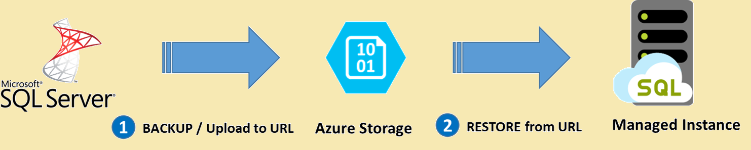 Diagram shows SQL Server with an arrow labeled BACKUP / Upload to URL flowing to Azure Storage and a second arrow labeled RESTORE from URL flowing from Azure Storage to a SQL managed instance.