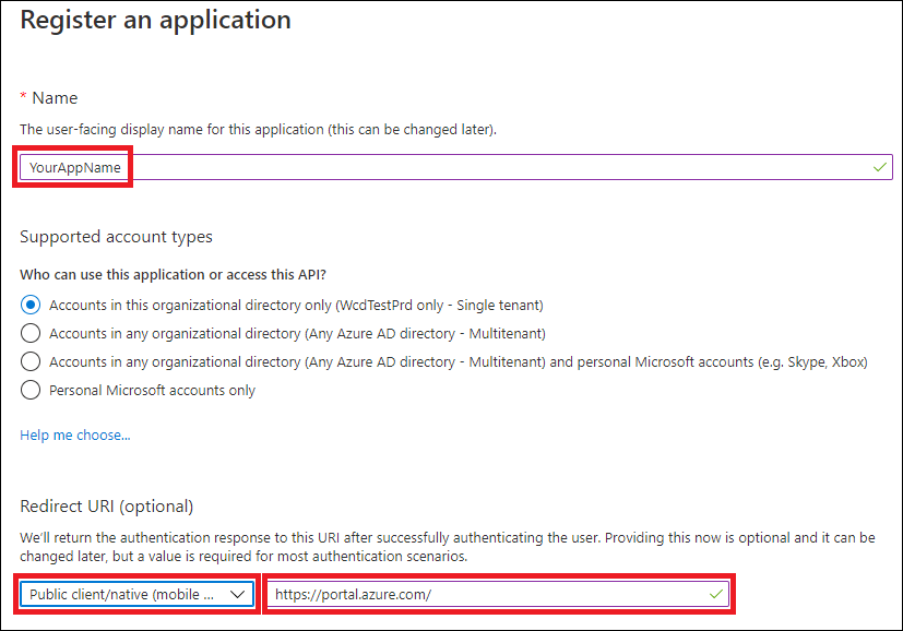 In the form, choose a name for your application and enter the following information for the redirect URI, then select Register.