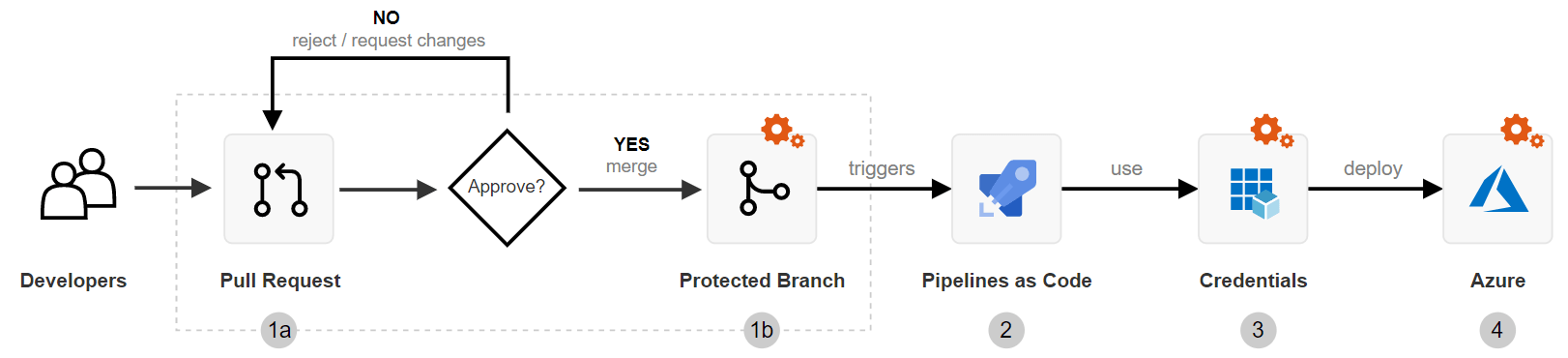 Because your source code defines and triggers deployments, your first line of defense is to secure your source code management (SCM) repository. In practice, this is achieved by using the Pull Request workflow in combination with branch policies, which define checks and requirements before code can be accepted.