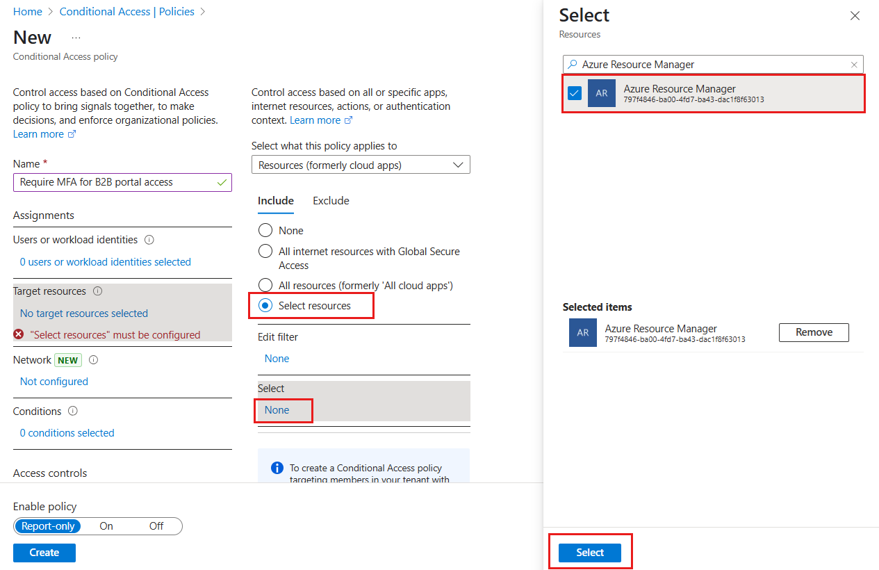 Under Target resources > Resources (formerly cloud apps) > Include > Select resources, choose Azure Resource Manager, and then Select the resource.