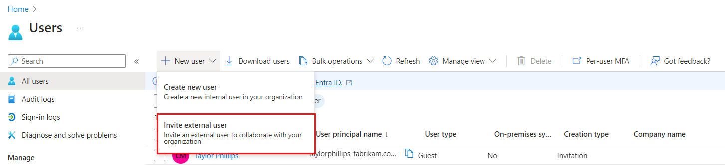 Select New user and then Invite external user.