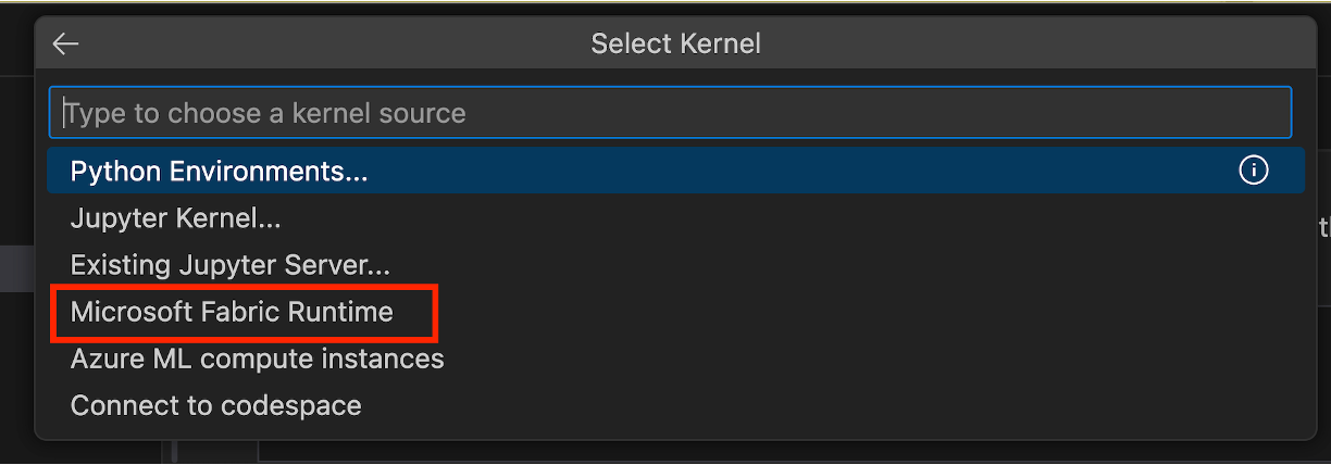 Select the kernel Microsoft Fabric Runtime to run code cells on the remote Spark compute.
