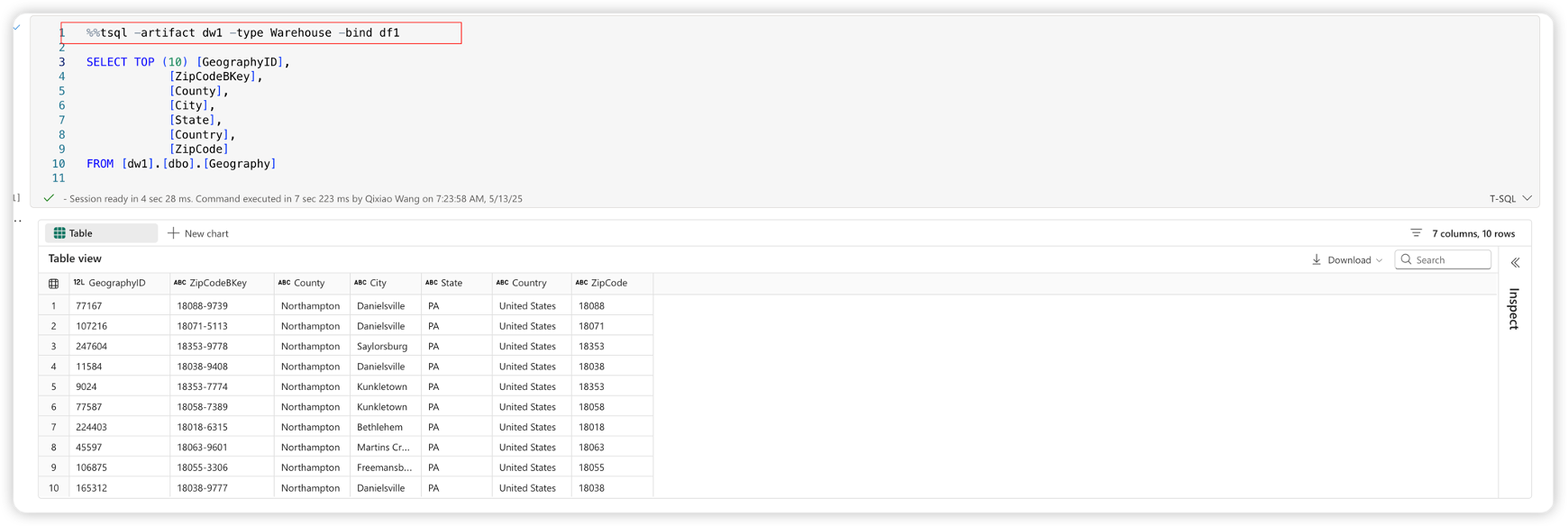 df = %tsql SELECT TOP({count}) * FROM [dw1].[dbo].[Geography];