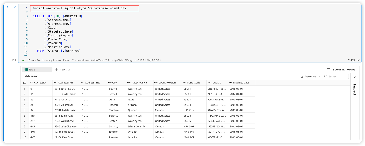 2. Use line magic: After initializing the session, you can use %tsql in following cells. The line magic will use the connection established in step 1 without requiring you to specify -artifact and -type again. For example: