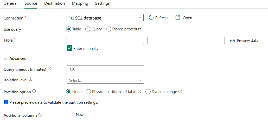 | Partition option | The data partitioning options used to load data from SQL database. | • None • Physical partitions of table • Dynamic range |