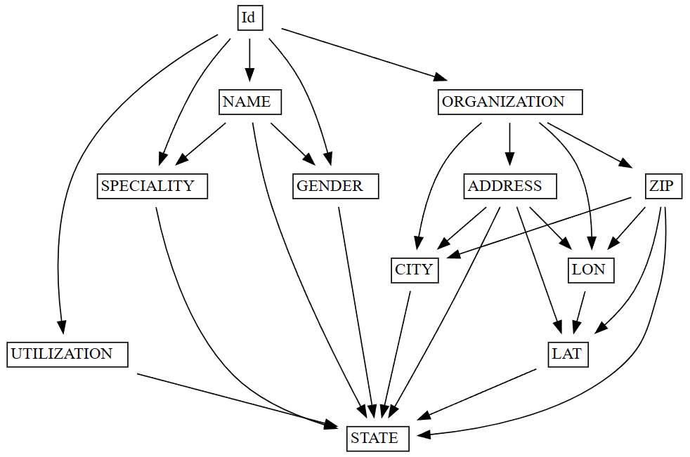 In this example, the function enforces a functional constraint between the ZIP (determinant) and CITY (dependent) columns. For each value of the determinant, the function picks the most common value of the dependent column, and drops all rows with other values. For example, given this dataset, the row with CITY=Seattle is dropped, and the functional dependency ZIP -> CITY holds in the output: