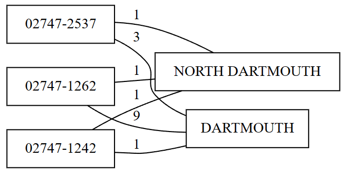 In this example, the function assumes an existing functional dependency between the ZIP (determinant) and CITY (dependent) columns. If the dataset has data quality problems - for example, the same ZIP code assigned to multiple cities - the function generates a graph of the violating values.