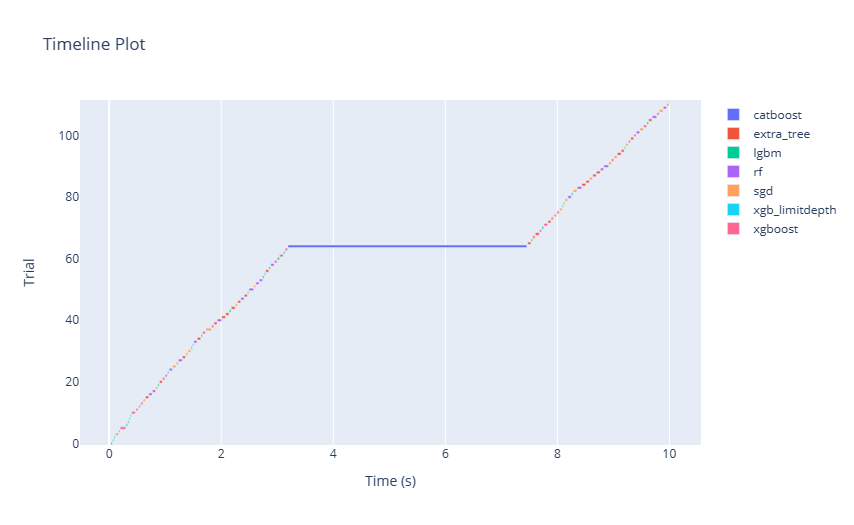 A timeline plot, often represented as a Gantt chart or a sequence of bars, visualizes the start, duration, and completion of tasks over time. In the context of an AutoML or tuning experiment, a timeline plot can showcase the progression of various model evaluations and their respective durations, plotted against time. By observing this plot, users can grasp the efficiency of the search process, identify any potential bottlenecks or idle periods, and understand the temporal dynamics of different hyperparameter evaluations.