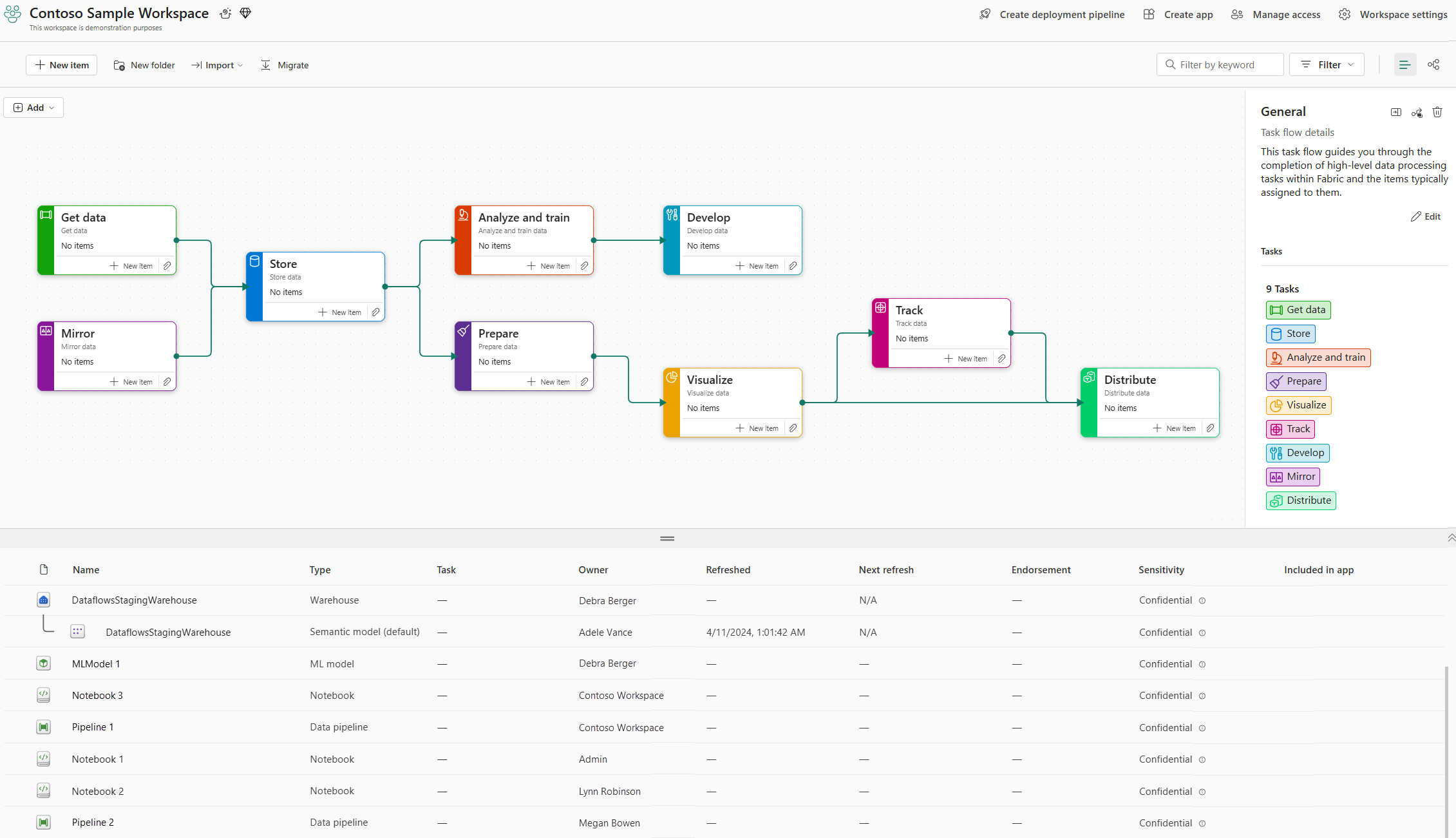 If the workspace contains Power BI items only, the task flow canvas will display a basic task flow designed to meet the basic needs of a solution based on Power BI items only.