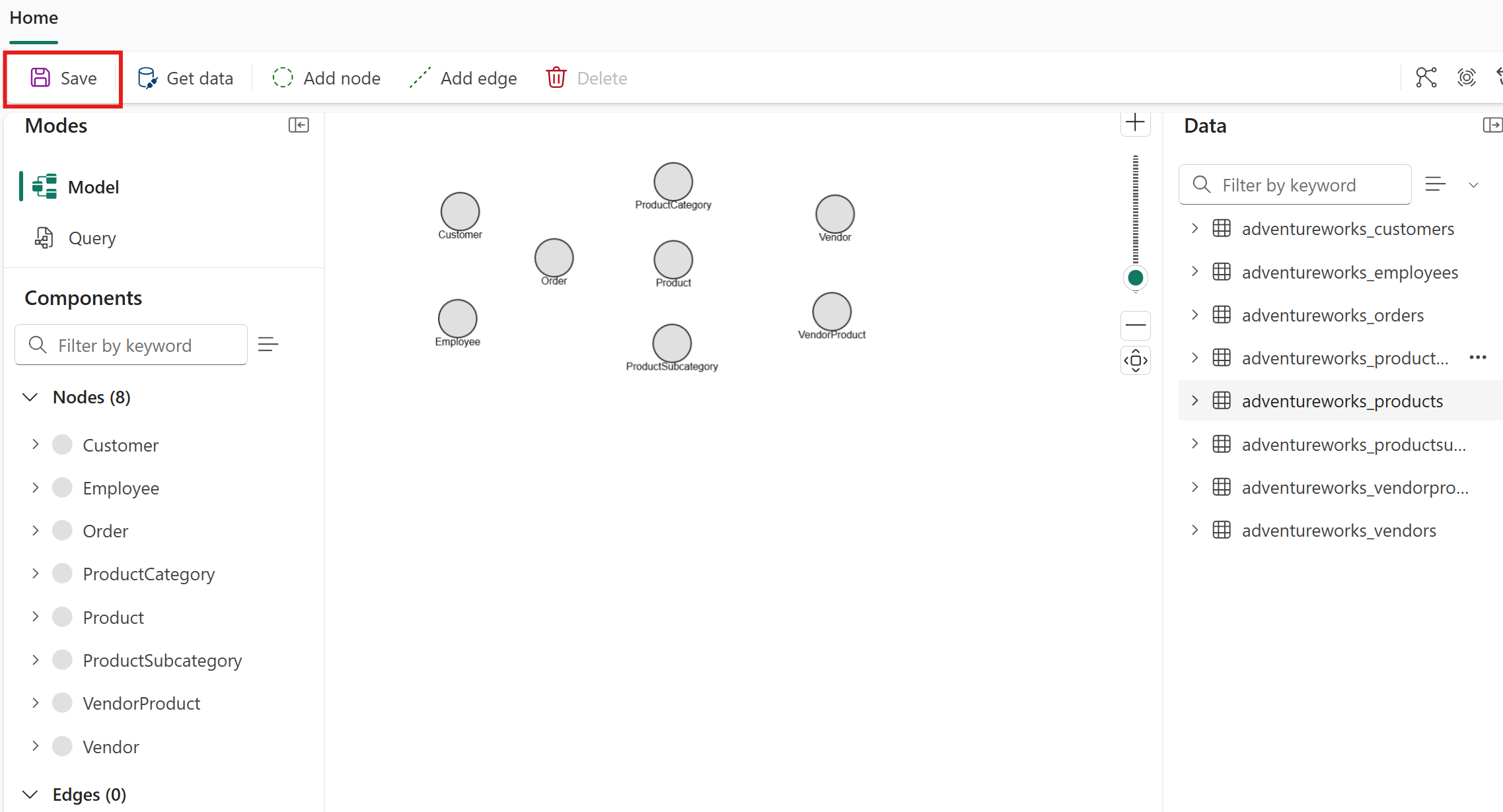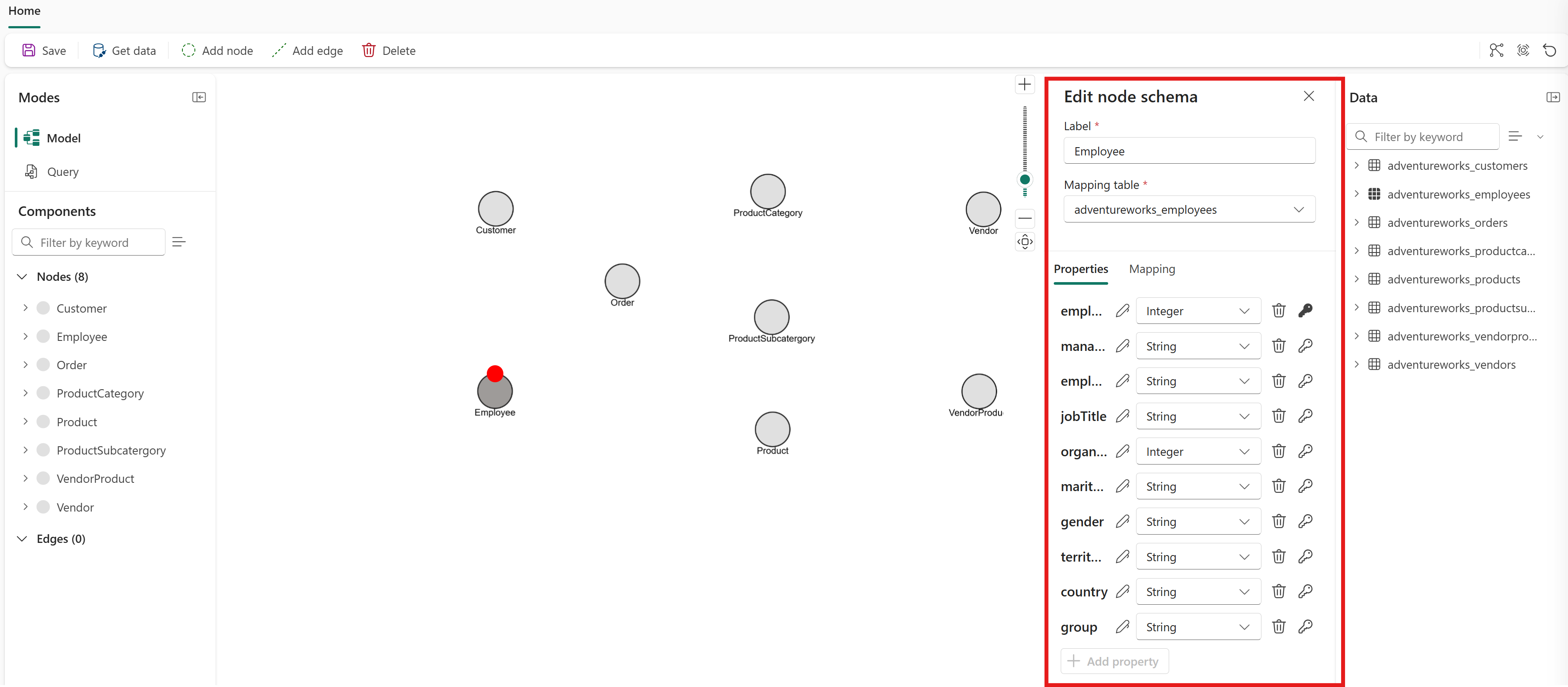 In the Adventure Works data model, create a node type for each entity. The following table shows the node mappings. Use this information to add node types to your graph: