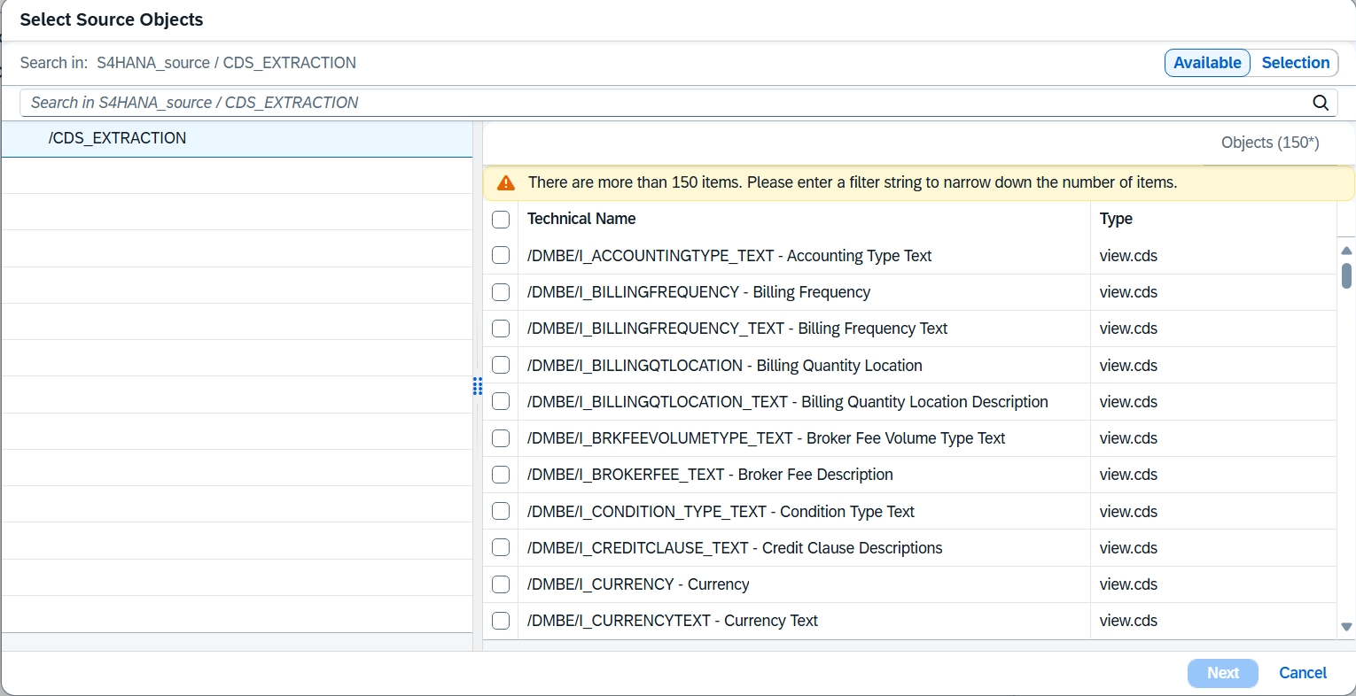 Select the appropriate source container, which is the type of source objects you want to replicate from. The following example uses CDS_EXTRACTION to replicate data from CDS views in an SAP S/4HANA on-premises source system. Then select Select.