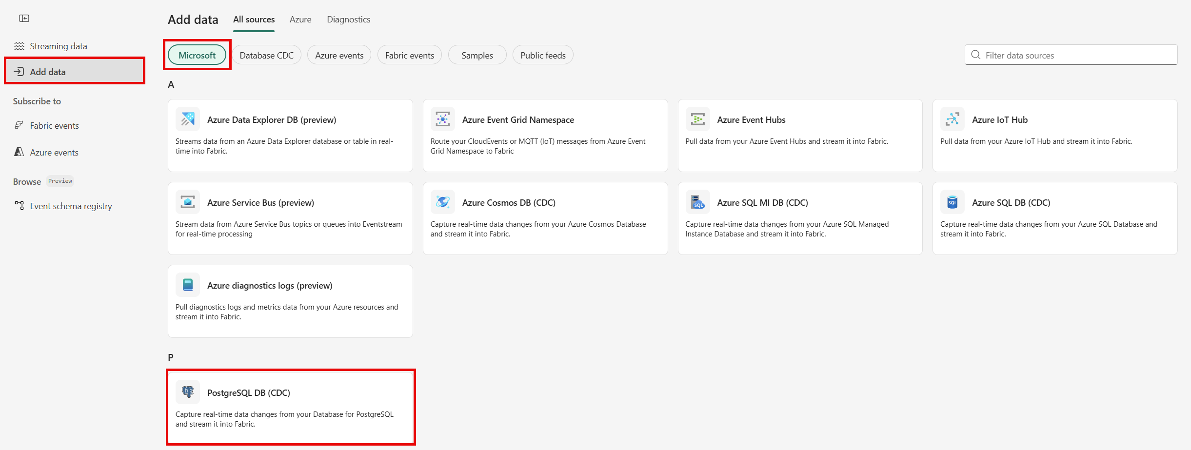 On the Data sources page, select Microsoft sources category at the top, and then select Connect on the Azure DB for PostgreSQL (CDC) tile.