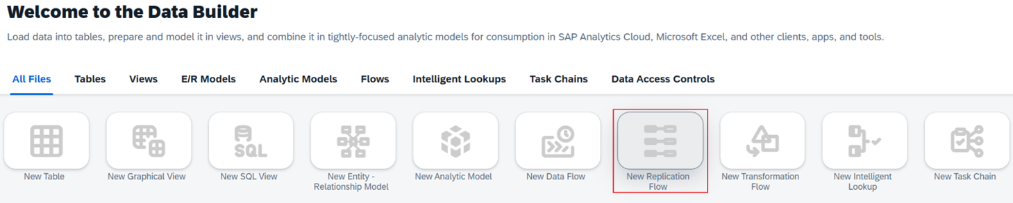 Select Data Builder in the left navigation and select New Replication Flow to open the editor.