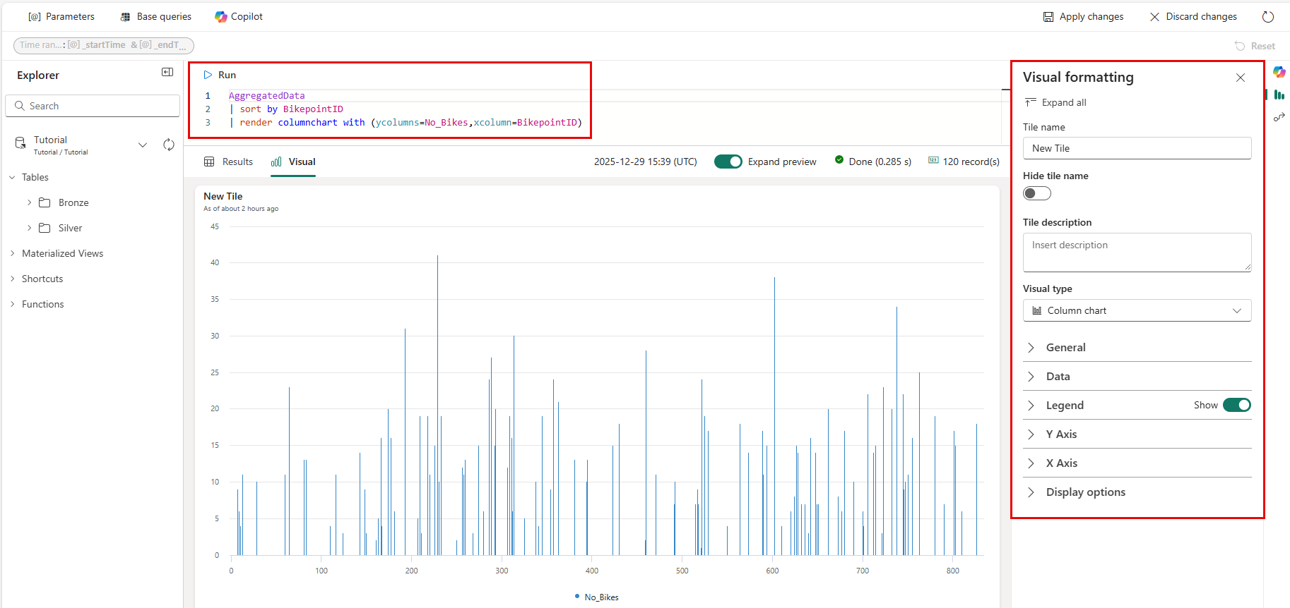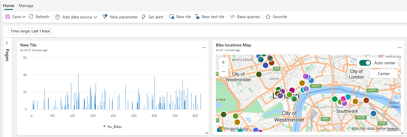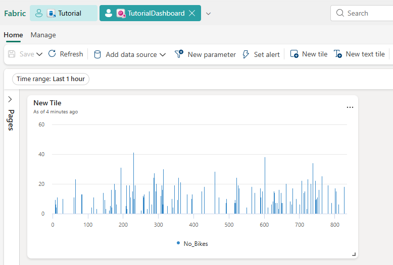 AggregatedData | sort by BikepointID | render columnchart with (ycolumns=No_Bikes,xcolumn=BikepointID)Select Save to dashboard > New Real-Time Dashboard.