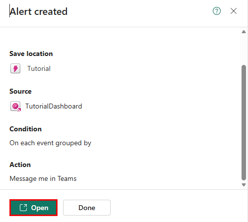 Field Value Details Rule name High Bike Count Alert Monitor Run query every 5 minutes Condition Check On each event grouped by* Grouping field No_Bikes When BikepointID Condition Is greater than Value 30 Occurrence Every time the condition is met Action Select action Message to individuals To Your Teams user name Headline Activator alert High Bike Count Alert Notes The condition for 'High Bike Count Alert' has been met Save location Workspace The workspace where the tutorial resources reside Item Tutorial Select Create. When you see the success message, select Open.