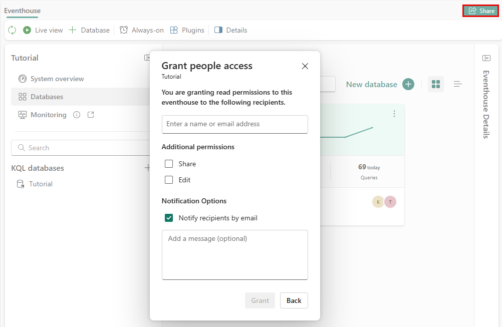 Open the Tutorial eventhouse, select Databases, and select the Share button.