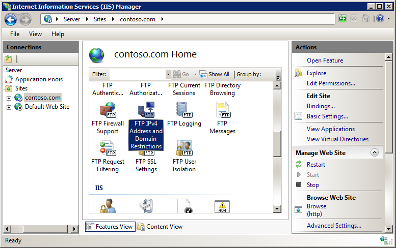 In the Home pane, double-click the FTP IPv4 Address and Domain Restrictions feature.