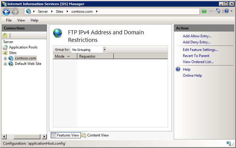 In the Home pane, double-click the FTP IPv4 Address and Domain Restrictions feature.