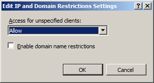 Choose the default access behavior for unspecified clients, specify whether to enable restrictions by domain name, and then click OK.