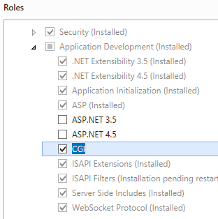 - On the Server Roles page, expand Web Server (IIS), expand Web Server, expand Application Development, and then select CGI. Click Next.