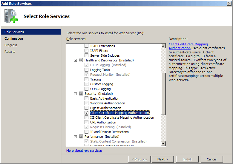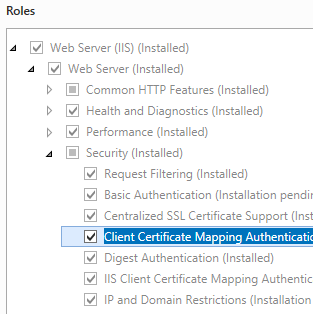 - On the Server Roles page, expand Web Server (IIS), expand Web Server, expand Security, and then select Client Certificate Mapping Authentication. Click Next.