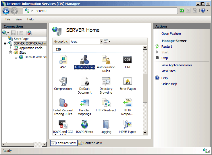 For more information, see Configuring Authentication in IIS 7.0 on the Microsoft TechNet Web site.